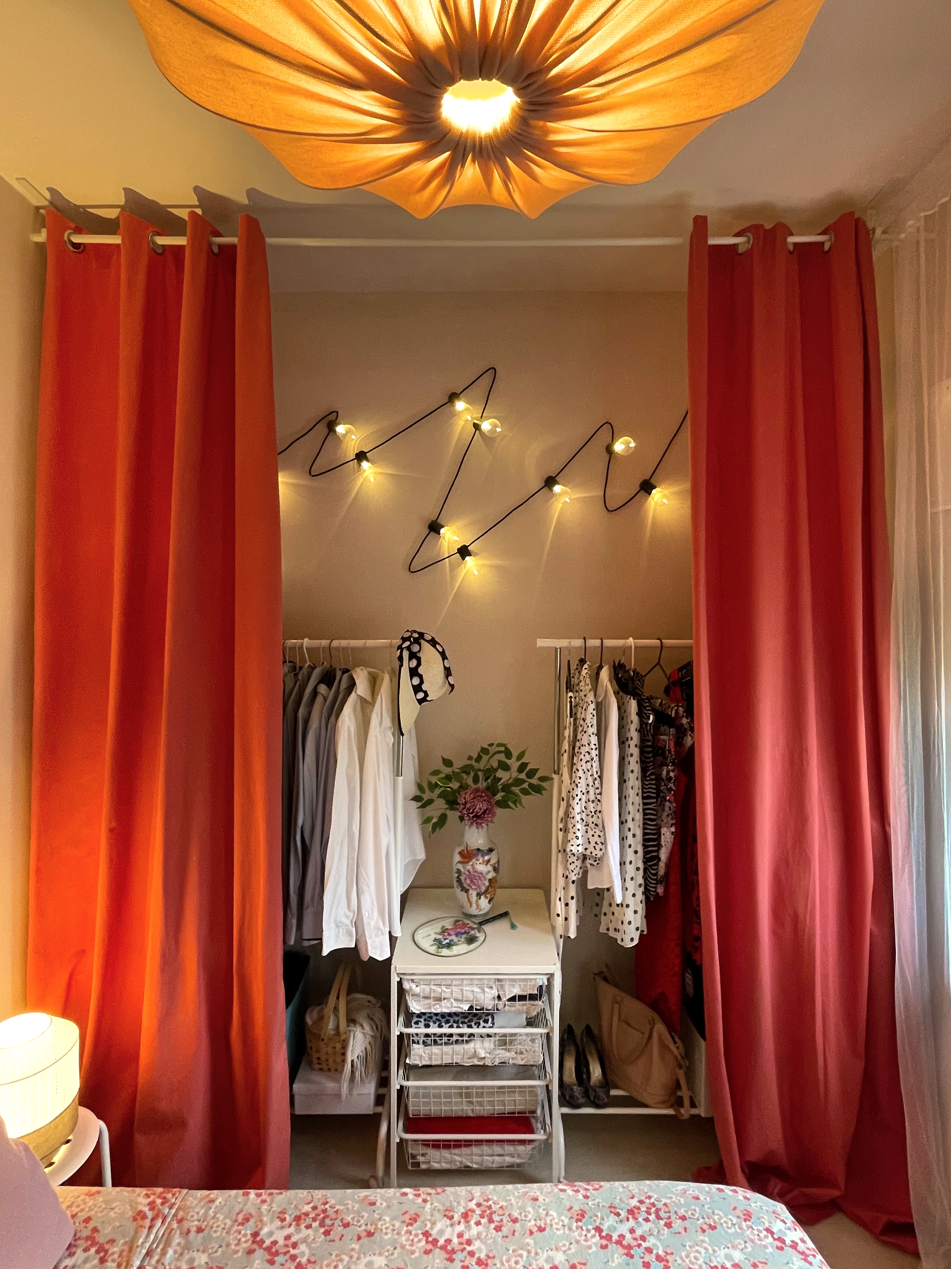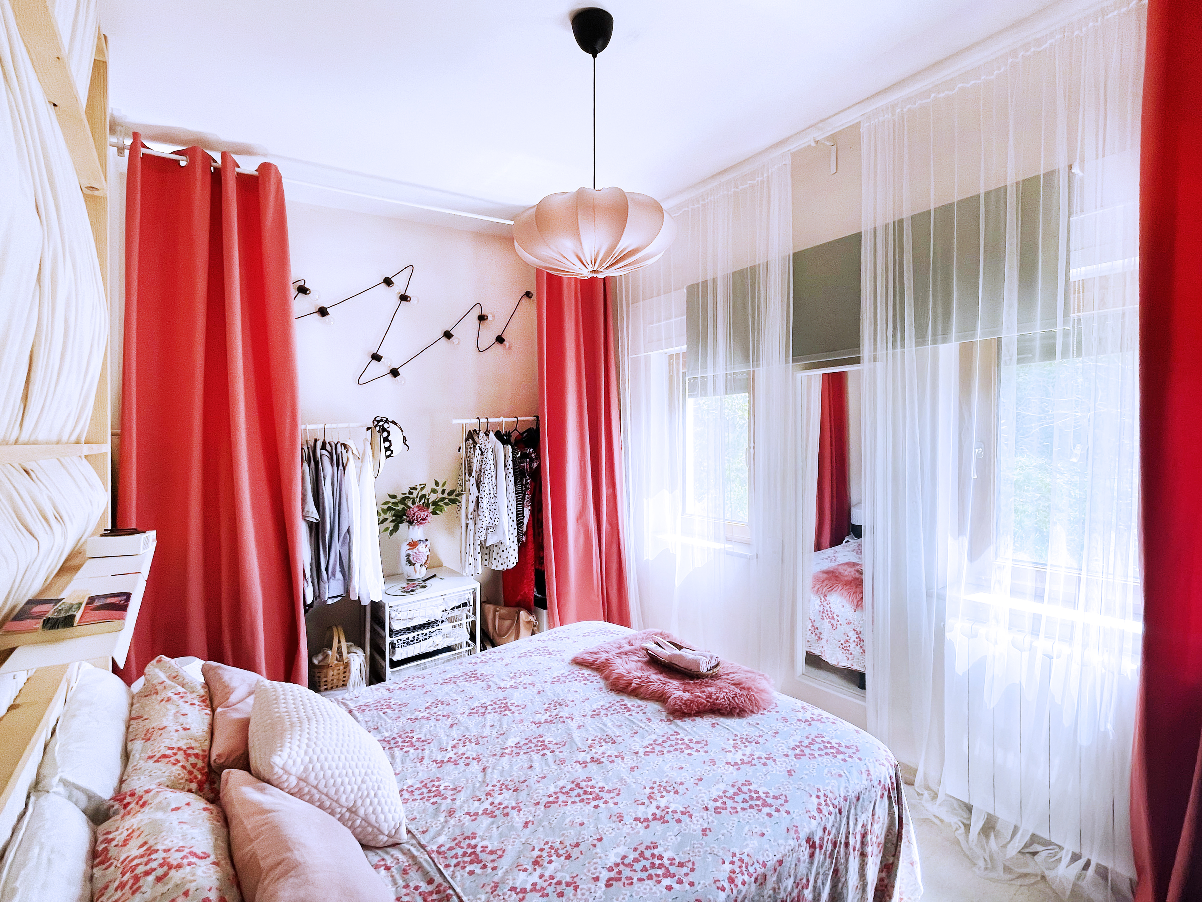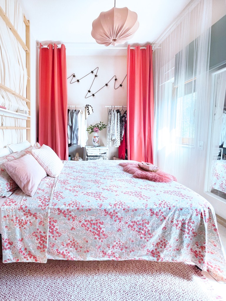 A bright Italian guest bedroom featuring coral tones and Japanese-inspired accents. Decorative elements like a traditional fan and ceramic vase bring character and artistry to the serene, inviting space.