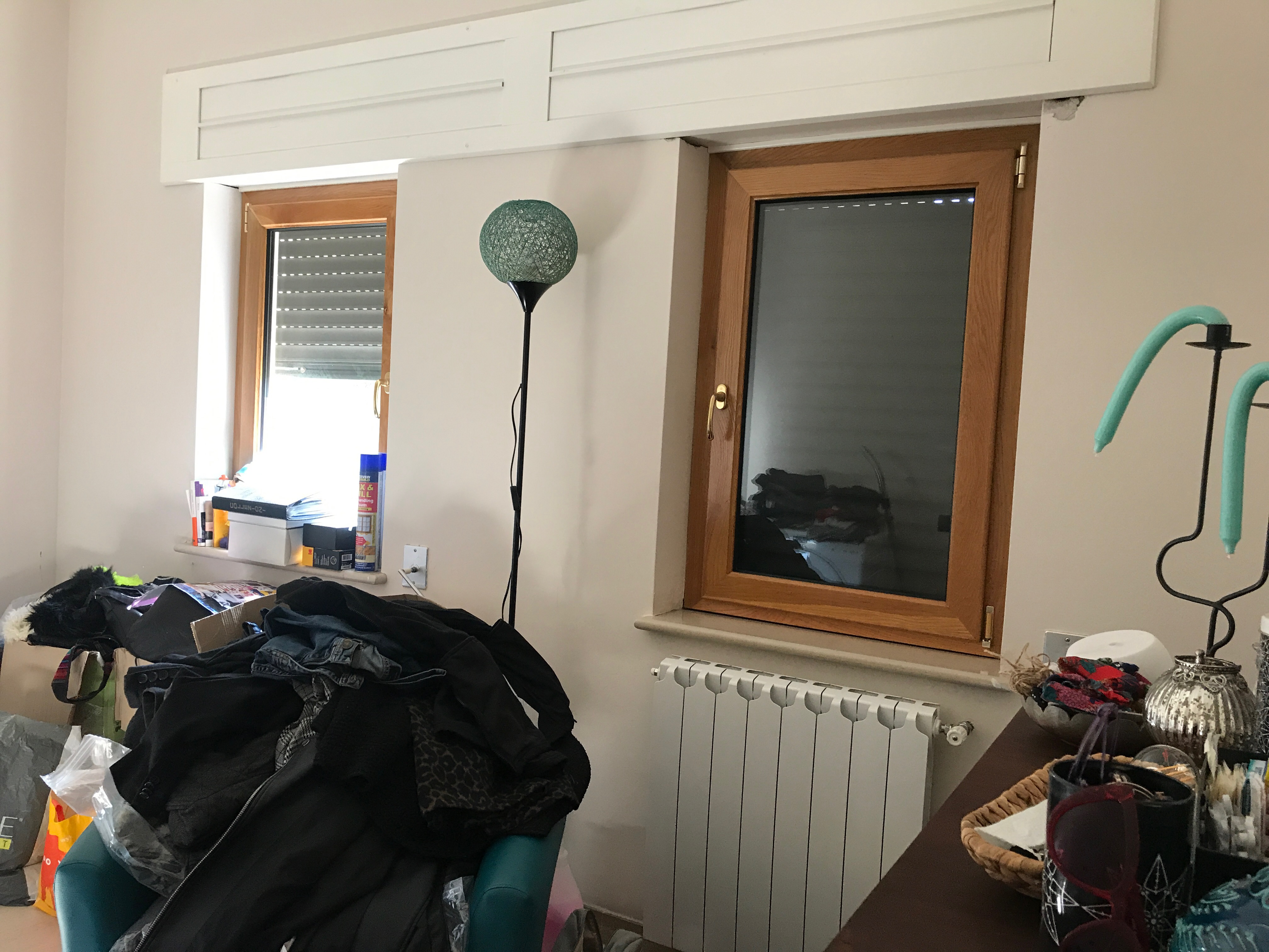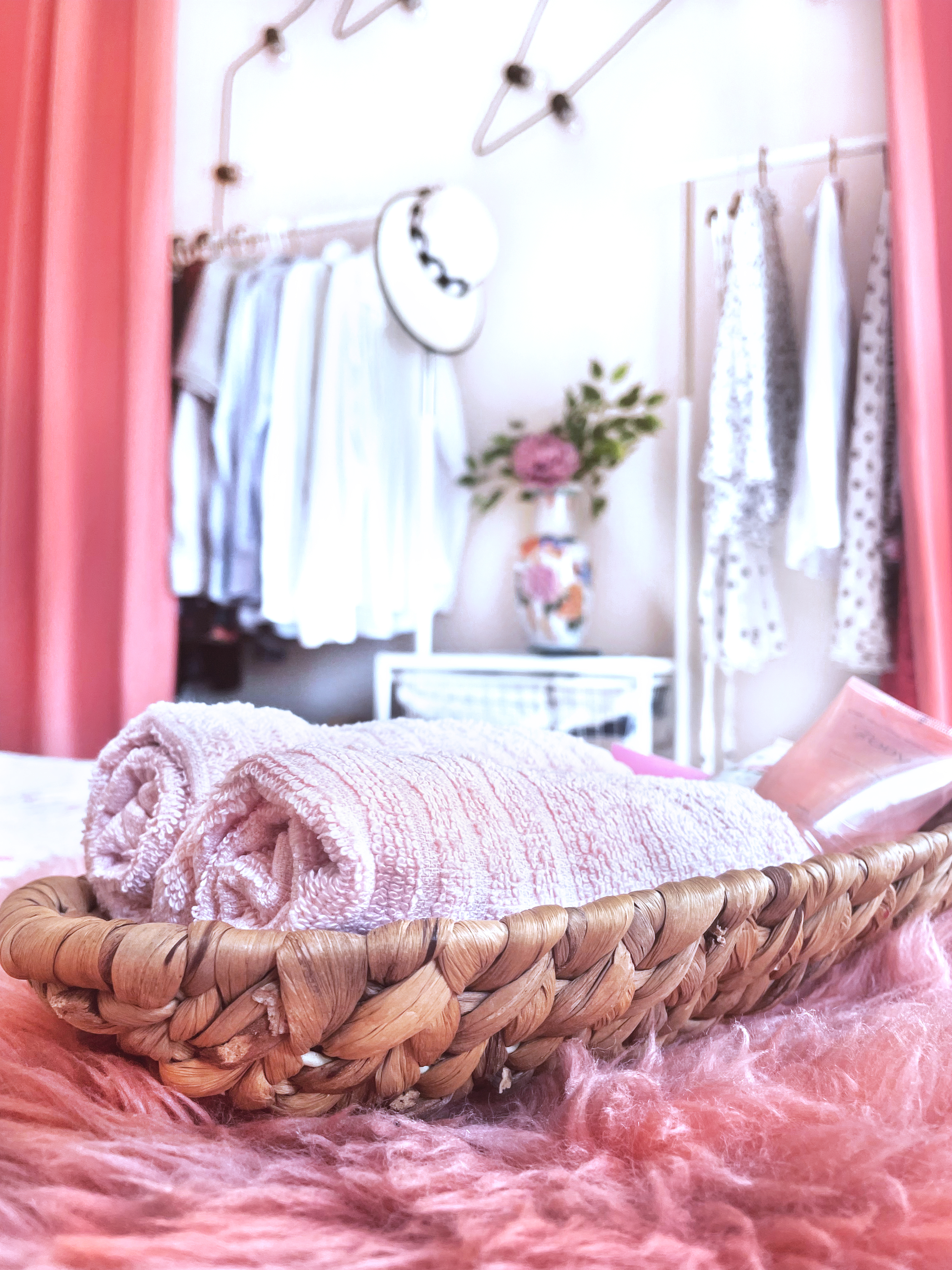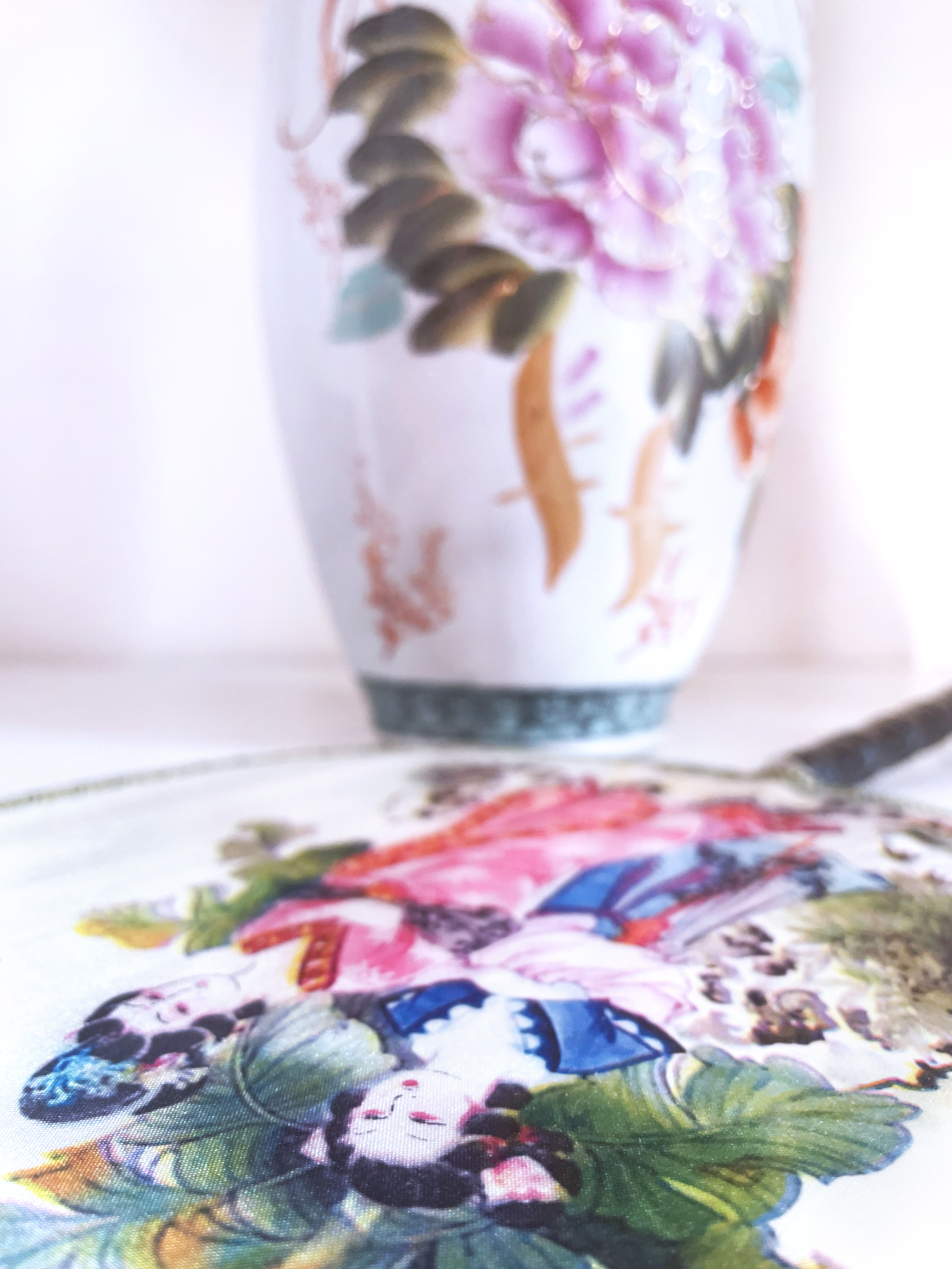 A bright Italian guest bedroom featuring coral tones and Japanese-inspired accents. Decorative elements like a traditional fan and ceramic vase bring character and artistry to the serene, inviting space.