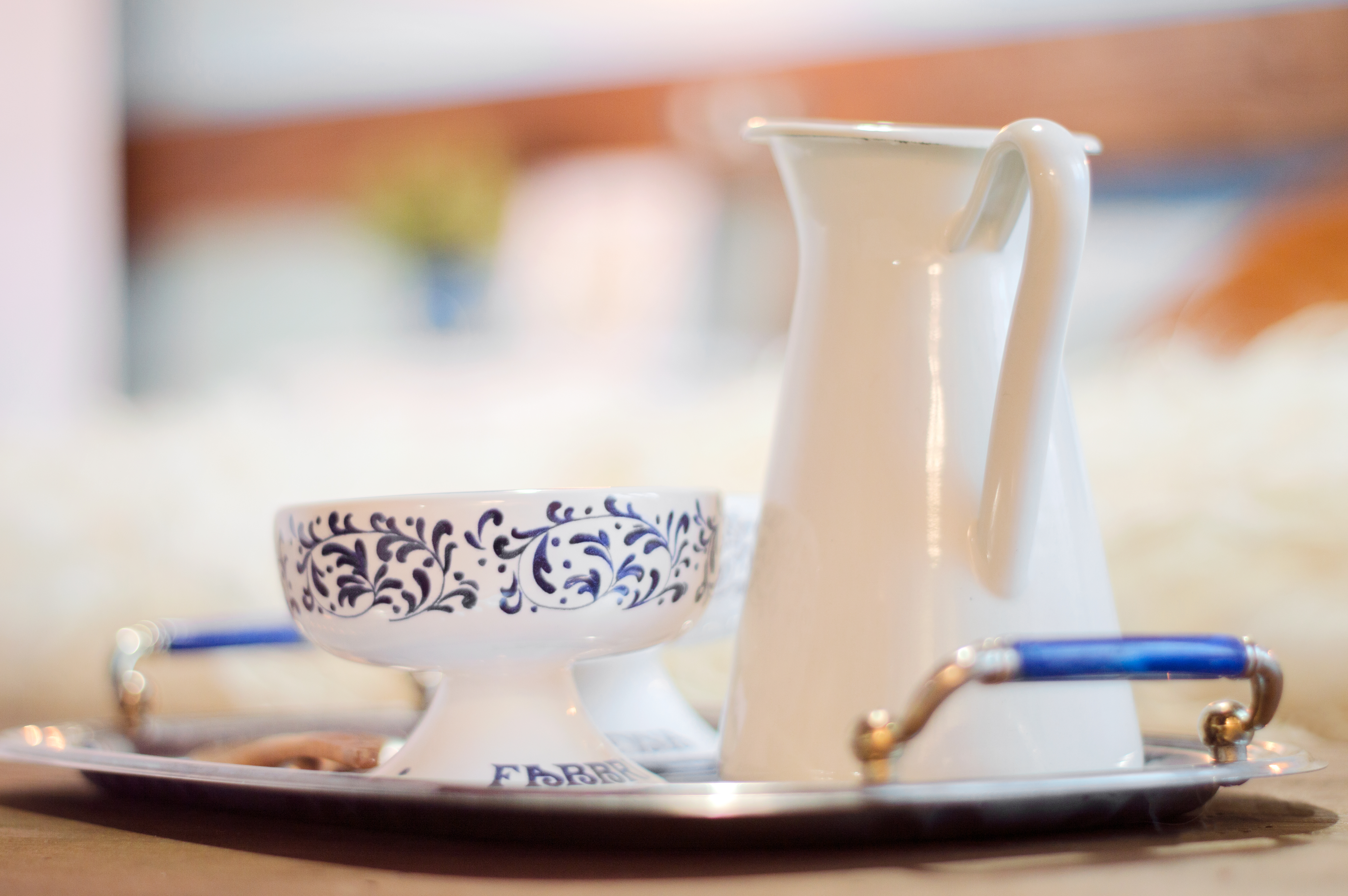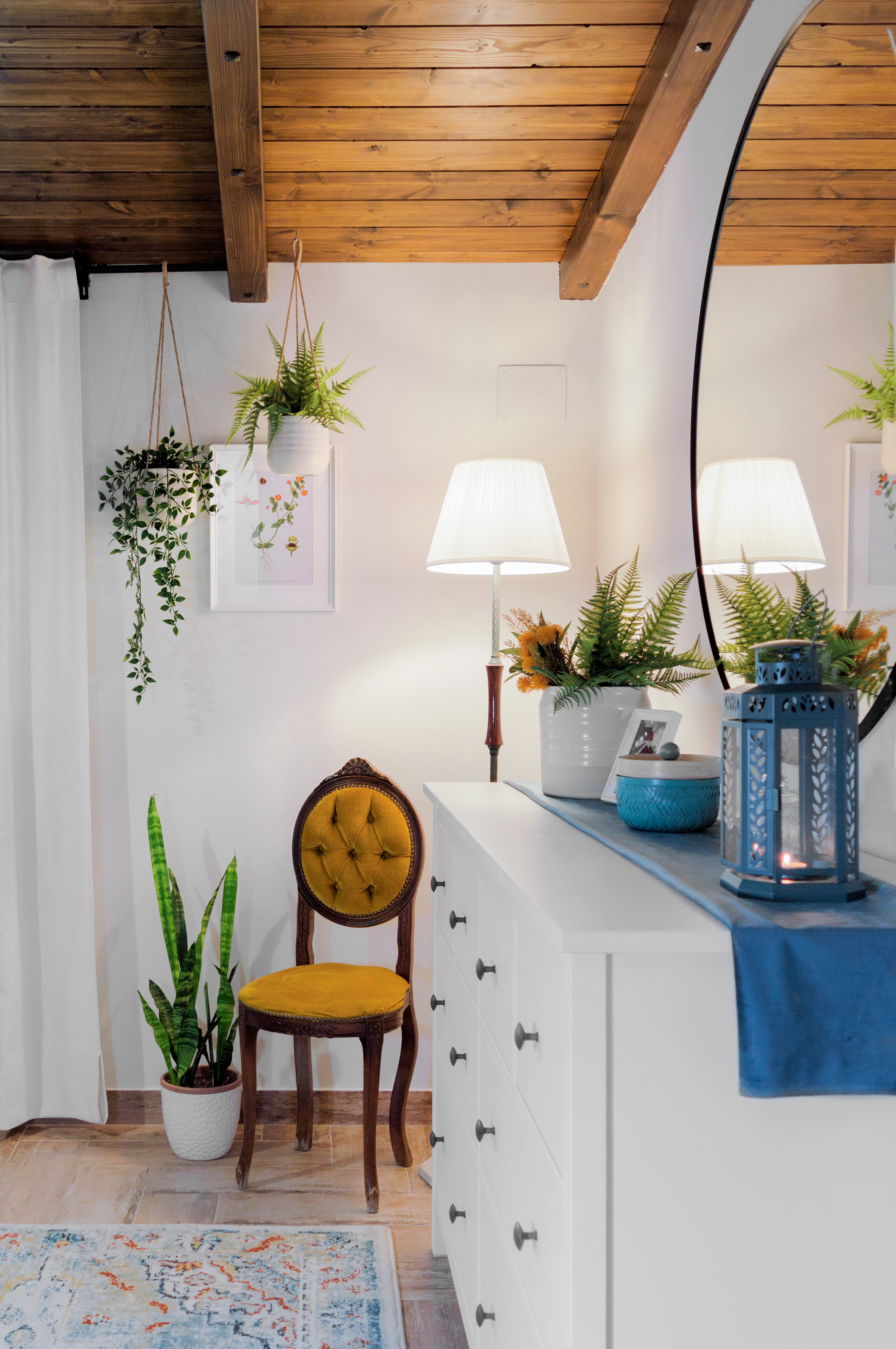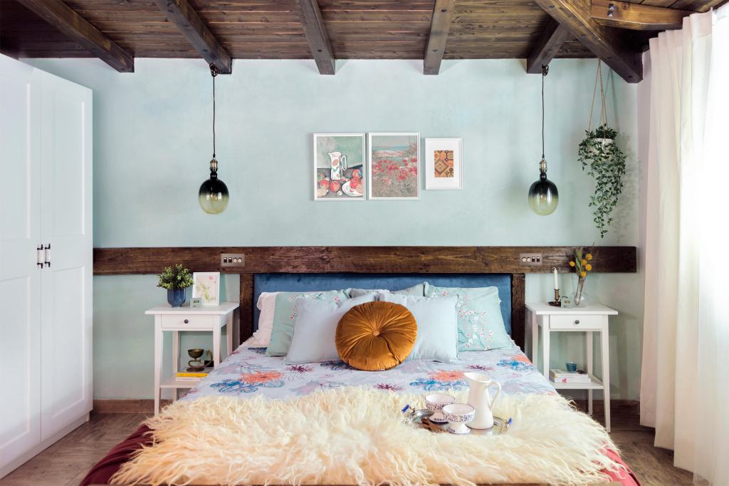 A bright, calming Italian countryside bedroom featuring a handcrafted headboard, a textured feature wall, and a detailed ceiling, complemented by carefully chosen artwork. Natural materials and layered textures create a warm, serene, and inviting retreat.