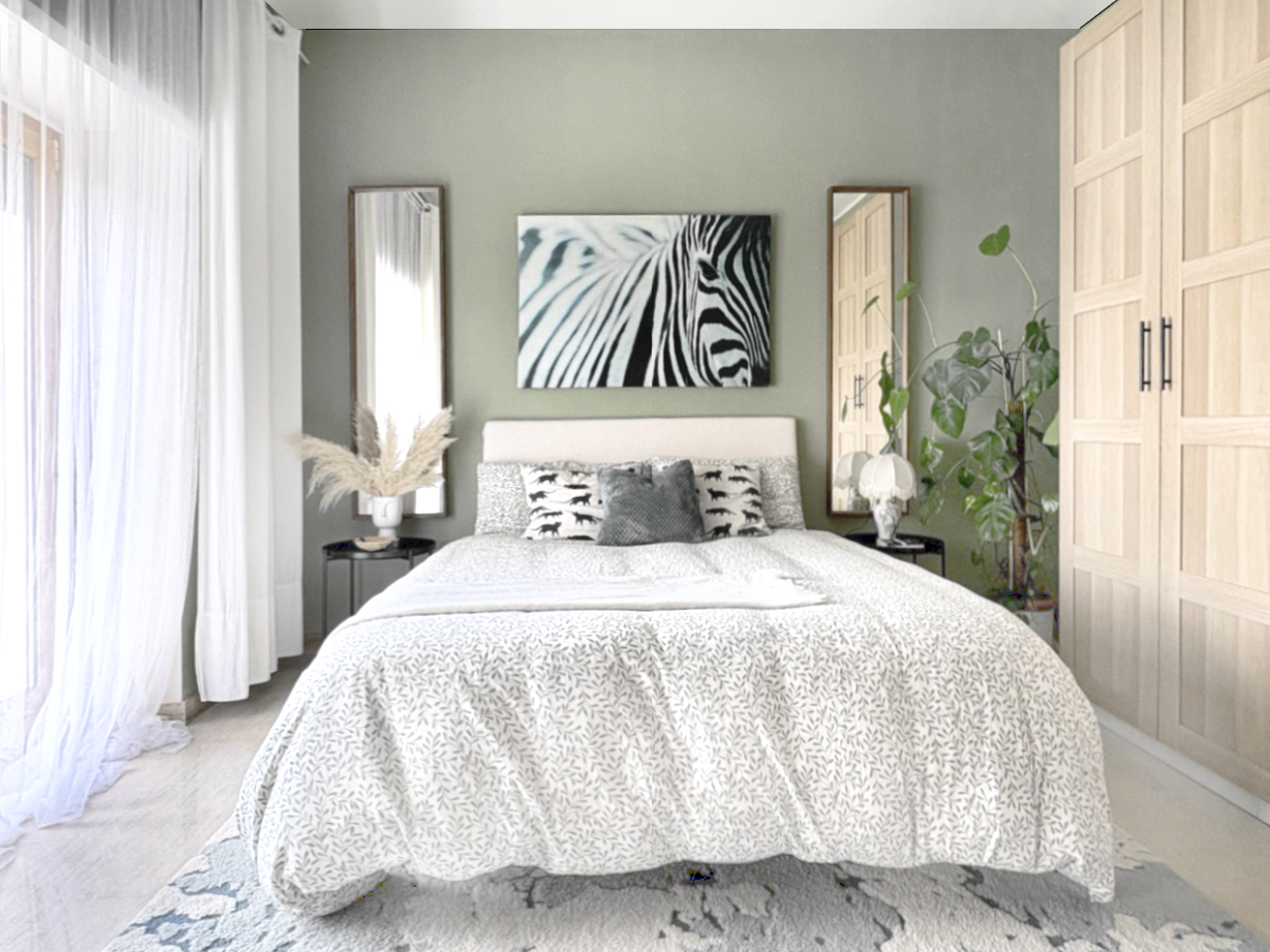 A contemporary bedroom in muted green tones, where clean lines and subtle accents create a calm, elegant atmosphere. Carefully layered materials and refined detailing add warmth and depth, shaping a serene and inviting retreat.